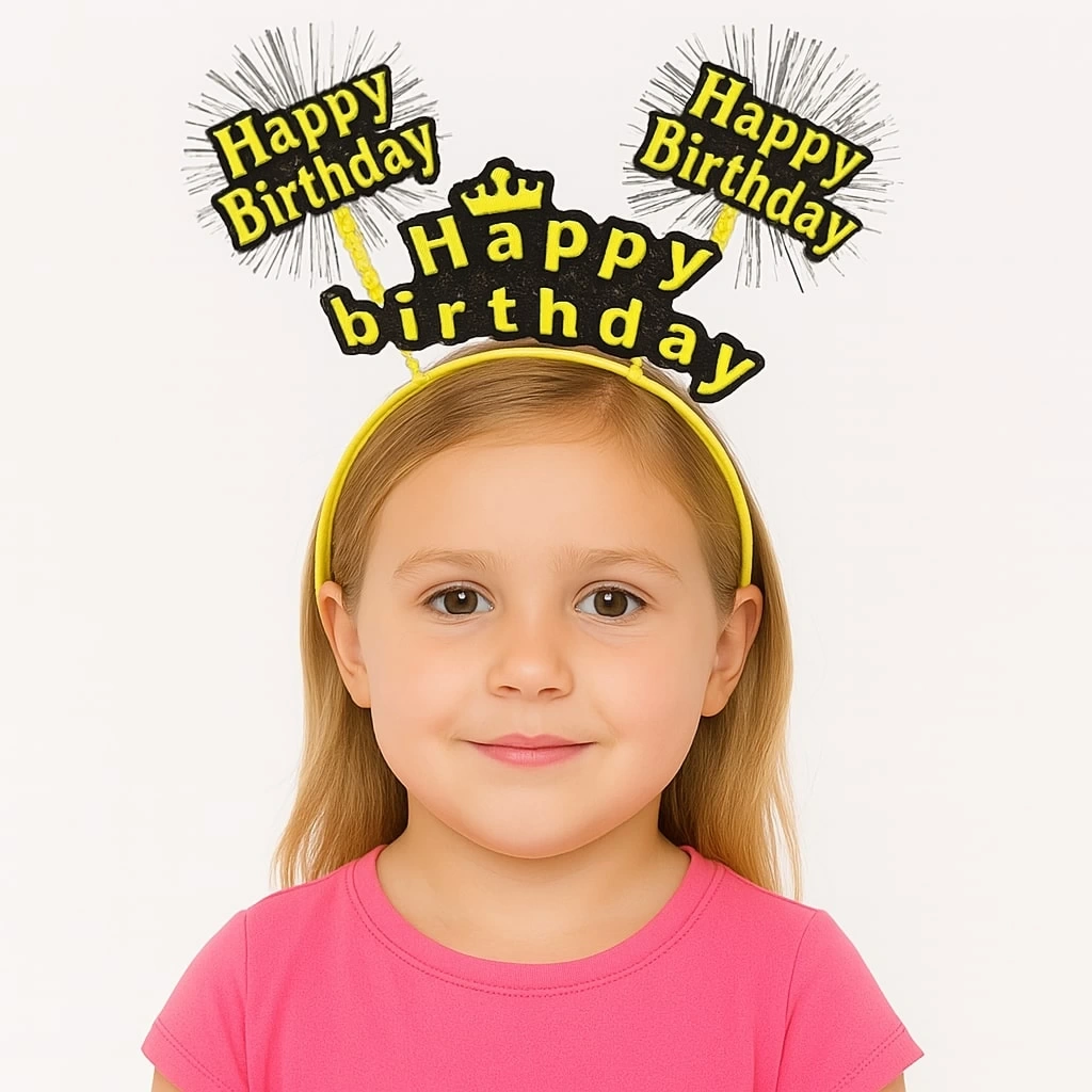 Doğum günü partilerini renklendirecek bu sarı Happy Birthday yazılı taç, çocukların kutlamalarında eğlenceli ve şık bir görünüm sunar. Parlak sarı detayları, ışıldayan yıldız patlaması figürleri ve esnek yapısı ile hem kız hem de erkek çocuklar için uygundur.