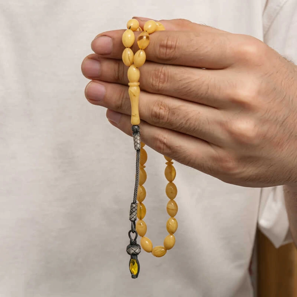 Gümüş 1000 Ayar Kazaz Püsküllü Sıkma Kehribar Tesbih