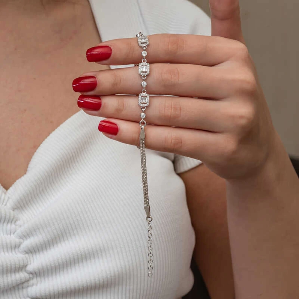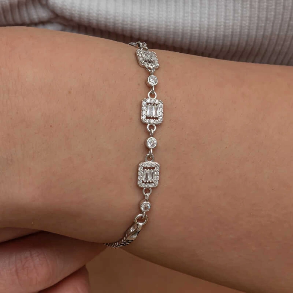 Üçlü baget taşlı kadın bileklik, şıklığı ve zarafeti bir araya getiren bir aksesuar türüdür.Bu bileklik, hem günlük kullanımda hem de özel günlerde rahatlıkla tercih edilebilecek bir aksesuardır. Farklı stillerle kombinlenebilir ve birçok kıyafetle uyum sağlar. Gümüş üzerine rodyum kaplama yapılmıştır. Rodyum kaplama yapılan zirkon taşlı kare kadın bileklik modelleri parlaklığını uzun süre muhafaza eder. Gümüş ve değerli taşlar nedeniyle belirtilen ortalama ürün ağırlığında ± %10 sapma olabilmektedir.