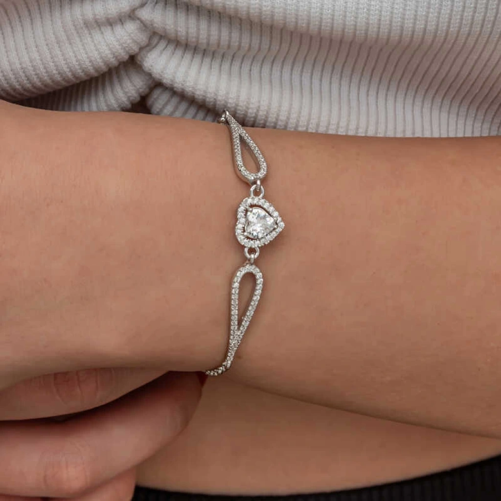 Zirkon taşlı kalp bileklik, şıklığı ve zarafeti bir araya getiren özel bir takı parçasıdır.Zirkon taşları, parlak ve ışıltılı yapısıyla bilekliği daha göz alıcı hale getirirken, kalp şekli de aşkı ve bağlılığı simgeler.Gümüş üzerine rodyum kaplama yapılmıştır. Rodyum kaplama yapılan kalp bileklik parlaklığını uzun süre muhafaza eder ve oksitlenmesi gecikir. Tüm kadın bilekliklerde olduğu gibi gümüş kalp kadın bileklik de el emeği ile üretilmiştir. Gümüş ve değerli taşlar nedeniyle belirtilen ortalama ürün ağırlığında ± %10 sapma olabilmektedir.