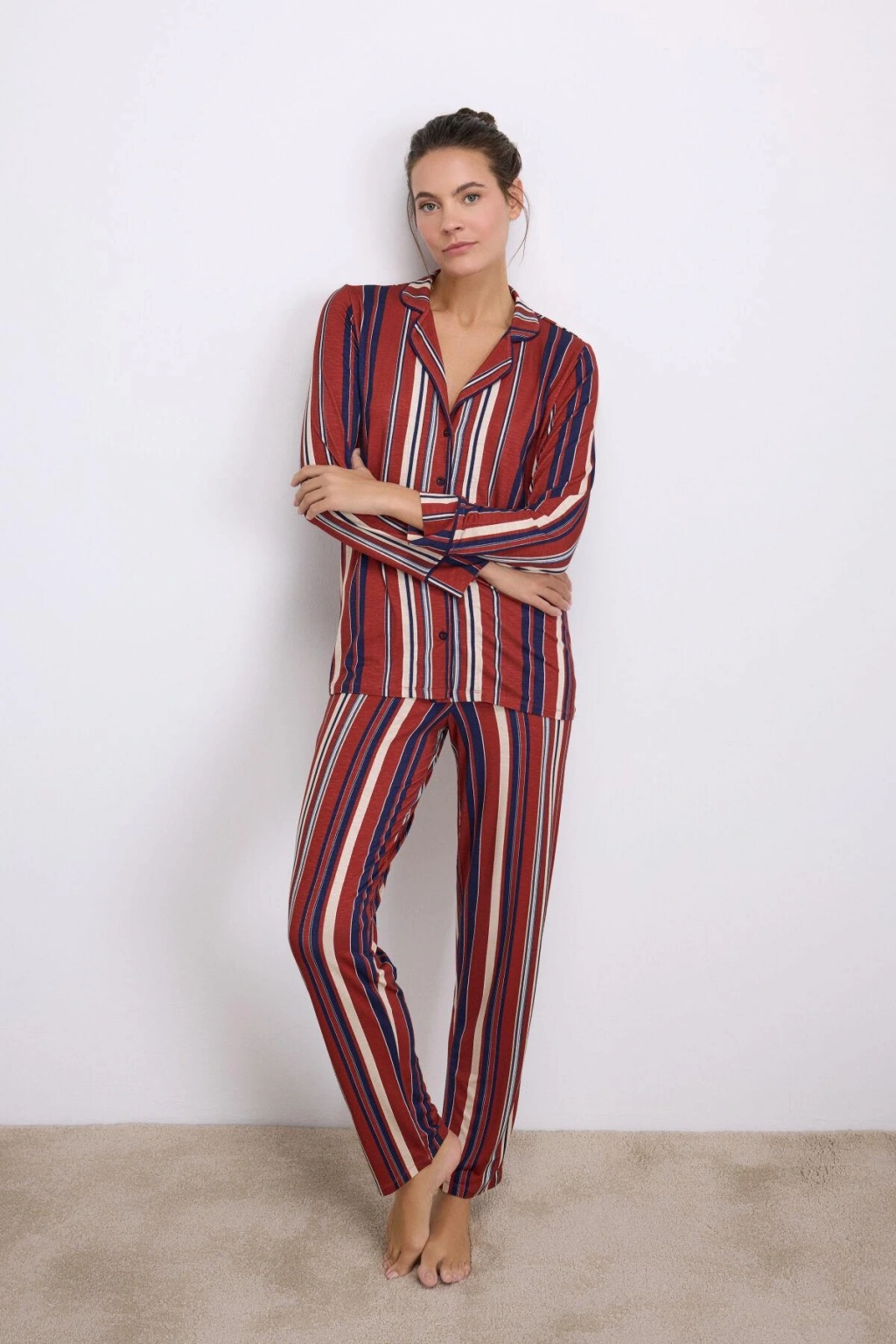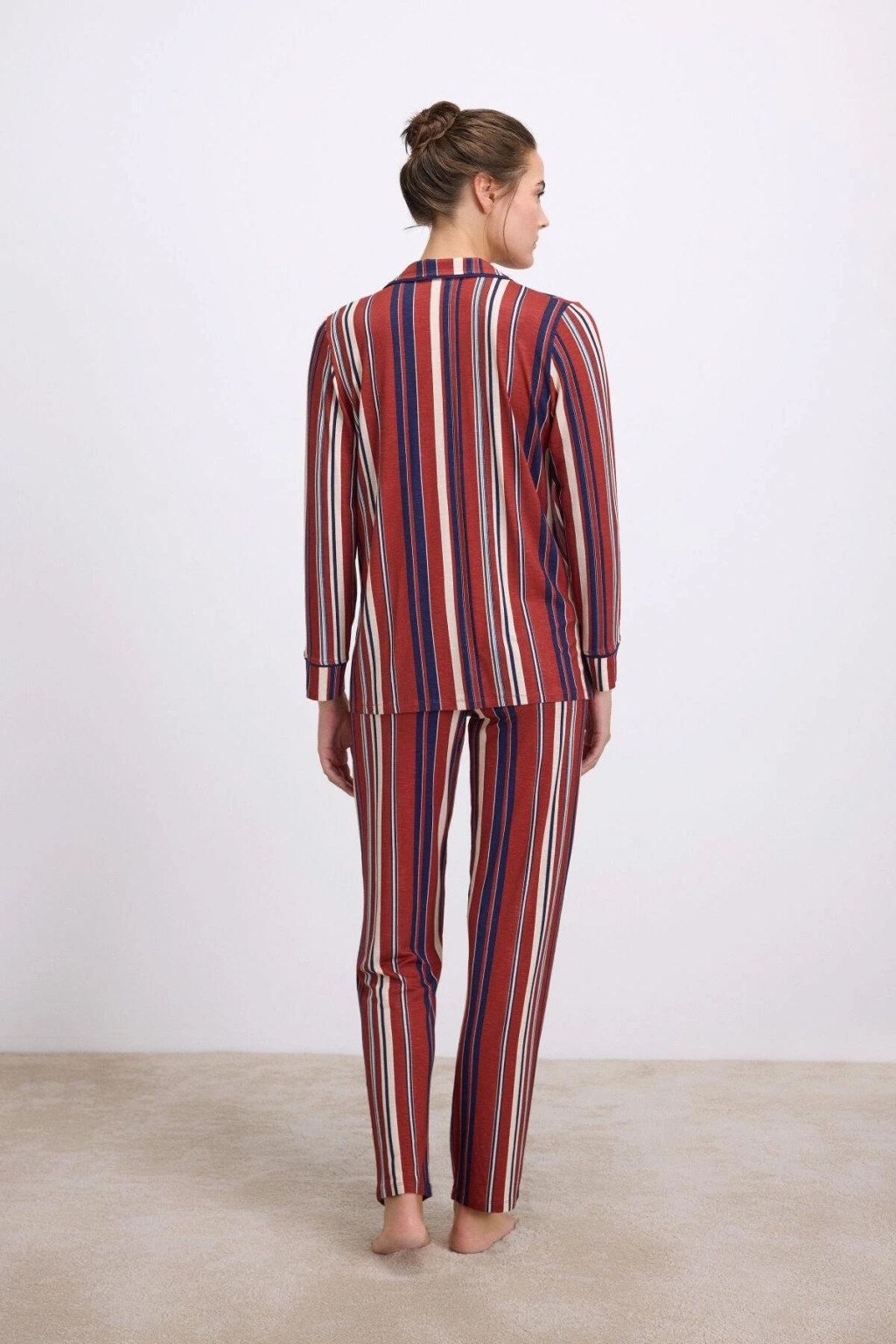 Uzun kollu düğmeli üst, çizgili modern tasarımıyla klasik pijama şıklığını yeniden yorumlarken; aynı desenli rahat kesim pantolon ise esnek bel yapısıyla gün boyu konfor sunar. Hafif, akışkan ve kaliteli dokusu ile hem estetik hem de yüksek konforlu bir kullanım vadeder.