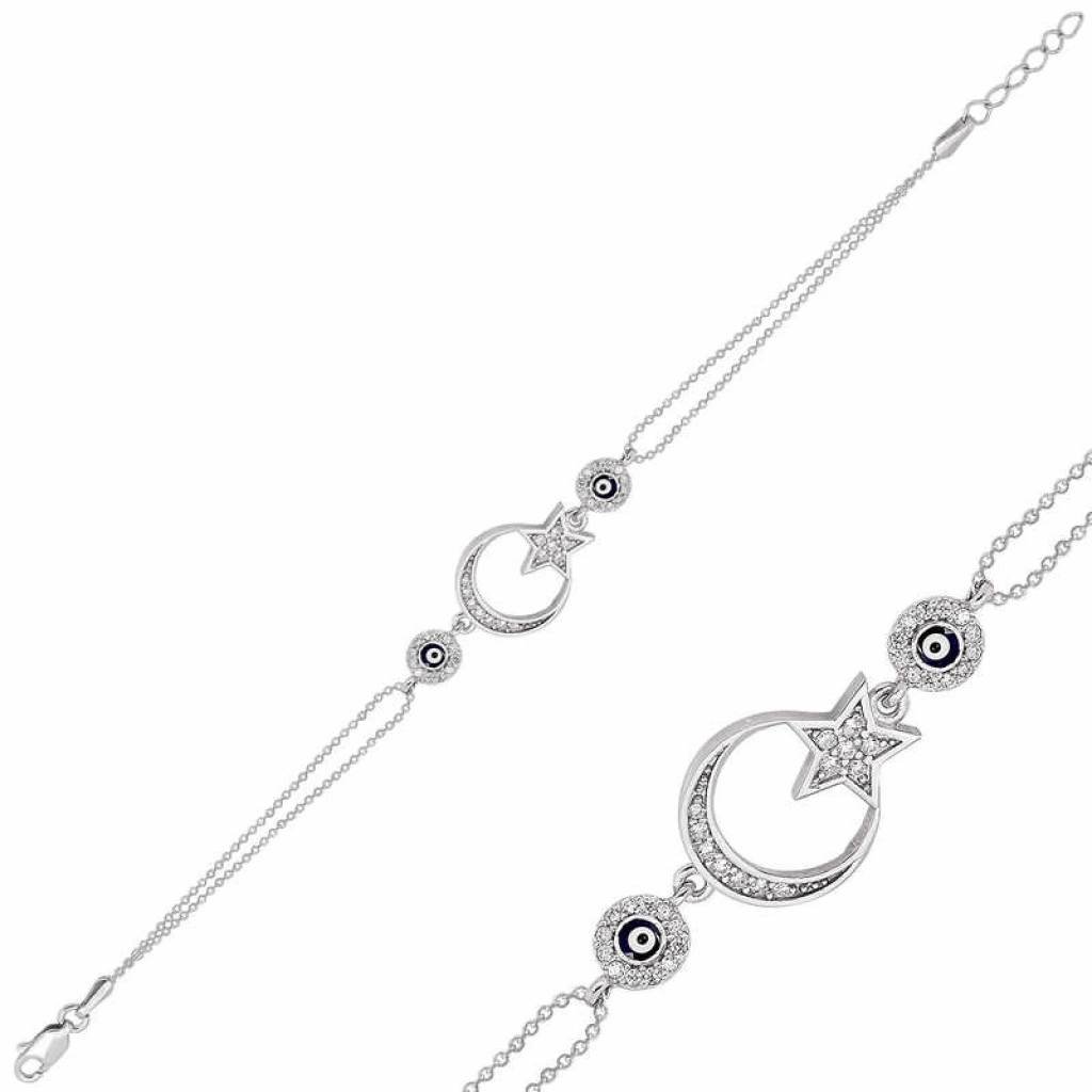 Türk bayrağının ilhamını da kan gölüne yansıyan ay ve yıldızdan aldığını biliyoruz. Bayrağın taşıdığı kutsal anlamı bileklerinde taşımak ve sevdiklerinizle paylaşmak için kaçırılmayacak bir fırsat sunuyoruz. 925 ayar gümüşten imal edilmiş olan bu ay yıldız nazar bayan bileklik modeli üzerindeki beyaz taşlar zirkondur. Gümüş üzerine rodyum kaplama yapılmıştır. Rodyum kaplama yapılan tüm gümüş bayan bileklik modelleri parlaklığını uzun süre muhafaza eder. Tüm gümüş bayan bileklik modellerimizde olduğu gibi gümüş ay yıldız nazar bayan bileklik de el emeği ile üretilmiştir. Gümüş ve değerli taşlar nedeniyle belirtilen ortalama ürün ağırlığında ± %10 sapma olabilmektedir.