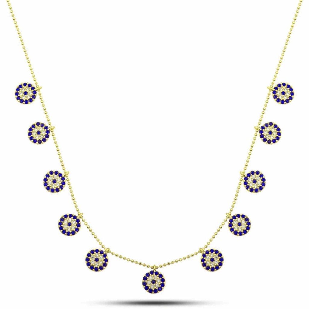 Gümüş nazar boncuğu sade tasarımıyla günlük hayatta rahatlıkla kullanabileceğiniz bir model. Nazar boncuğu sizi kem gözlerden alıkoyar. Bu şık gümüş kolye modeli üzerinde bulunan taşlar zirkondur. Gümüşün üzerine oksitlenmesi geciksin ve parlaklığını uzun süre muhafaza etsin diye gold kaplama yapılmıştır. Tamamen gümüş olan zincir uzunluğu ortalama 45 cm’dir. Bu nazarlı şans kolye modeli el emeği ile üretilmiştir. Gümüş ve değerli taşlar nedeniyle belirtilen ortalama ürün ağırlığında ± %10 sapma olabilmektedir.