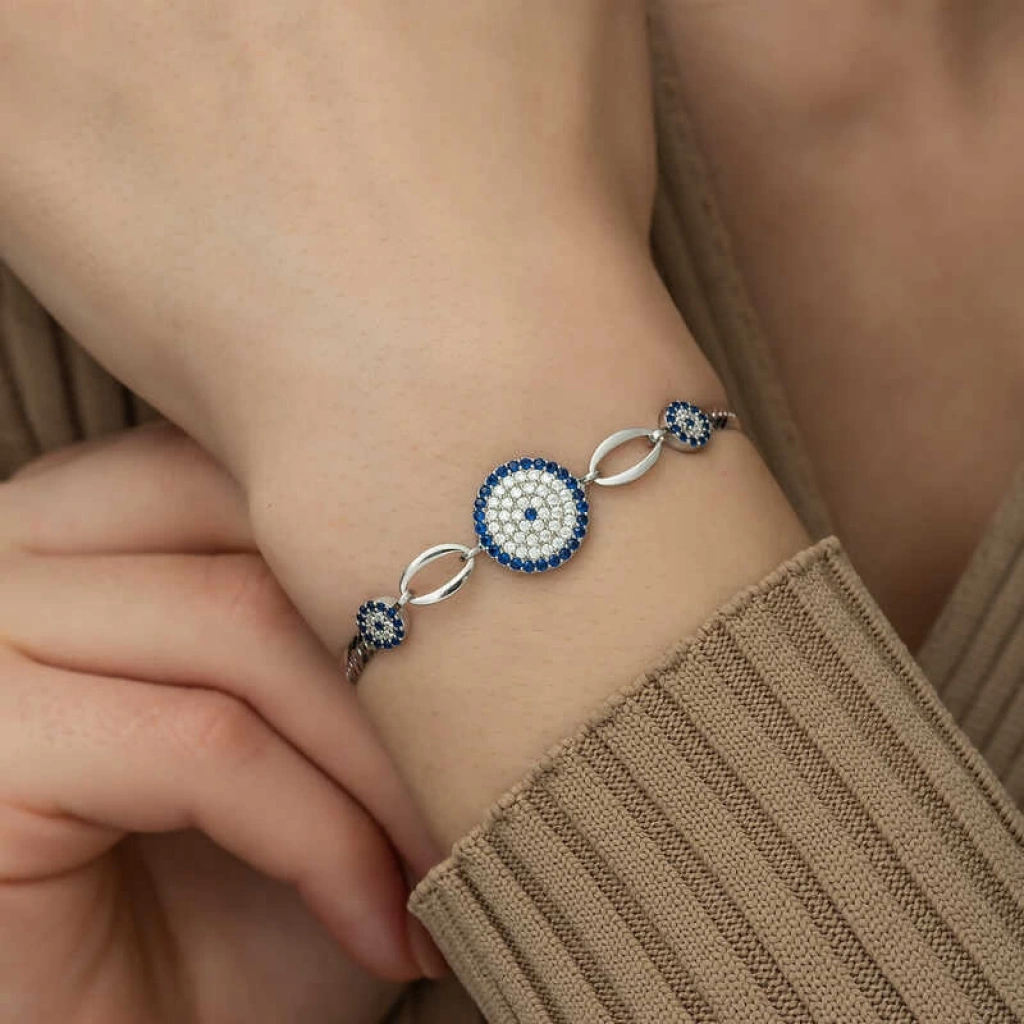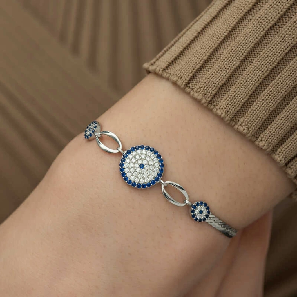 Nazar boncuğunu insanlar uzun yıllardan beri kötü bakıştan korunmak için kullanmışlardır. Kötü bakışların insanlar üzerinde olumsuz etki oluşturmasına karşı bir önlemdir, nazar boncuğu… Bu sebeptendir ki insanlar sevdiklerini korumak için nazar boncuğu takmaktadır. Bu nazar boncuklu bileklik de şıklığı ve zarafeti yansıtıyor. Her dönem sevilen ve şıklığından ödün vermeyen bu modeli; doğum günü hediyesi, sevgililer günü hediyesi veya annelere hediye olarak özel günlerde tercih edebilirsiniz. Gümüş nazar bayan bileklik, 925 ayar gümüşten imal edilmiştir. Gümüş üzerine rodyum kaplama yapılmıştır. Rodyum kaplama yapılan gümüş bayan bileklikler parlaklığını uzun süre muhafaza eder, oksitlenmesi gecikir. Üzerinde bulunan taşlar zirkondur. Tüm gümüş bayan bilekliklerinde olduğu gibi bu gümüş nazar boncuklu bayan bileklik modeli de tamamı el emeği ile üretilmiştir. Gümüş ve değerli taşlar nedeniyle belirtilen ortalama ürün ağırlığında ± %10 sapma olabilmektedir.