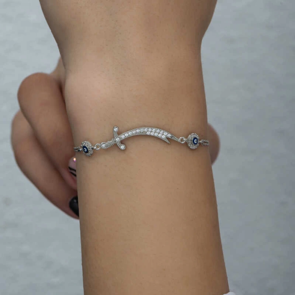 Hz. Ali Uhud savaşında çokça kahramanlık göstermiştir. Savaşta Peygamber Efendimizi korumak isterken kılıcı kırılır.Bunu gören Peygamber Efendimiz kendi kılıcı olan Zülfikar’ı kendisine vermiştir. Kılıcın keskinliği ile diğer kılıçları ortadan ikiye ayırmış ve savaşlarda destanlar yazdırmıştır. Hz. Ali Zülfikar kılıcıyla beraber savaşlardadır artık... Hz.Ali'nin vefatından sonra kılıcın cennete götürüldüğüne inanılıyor. Bir başka rivayete göre ise Dicle ve Fırat nehirlerinin arasında olduğu biliniyor. İslam ordularına hükmedecek kişi o kılıcın sahibi olup orduların başkomutanı olacaktır. Bu maneviyatla hazırlanmış olan bu tasarım çok dikkat çekicidir. Bu şık bileklik; doğum günü hediyesi, sevgililer günü hediyesi veya annelere hediye olarak özel günlerde tercih edilebilecek mükemmel bir seçenektir. Zülfikar kılıcı kadın bileklik modeli 925 ayar gümüşten imal edilmiştir. Bu özel tasarım üzerinde bulunan taşlar zirkondur. Bu kadın gümüş bileklik üzerine rodyum kaplama yapılmıştır. Rodyum kaplama yapılan bileklikler parlaklığını uzun süre muhafaza eder, oksitlenmeyi geciktirir. Tüm gümüş bilekliklerde olduğu gibi bu gümüş nazarlı Zülfikar kılıcı kadın bileklik modeli de el emeği ile üretilmiştir. Gümüş ve değerli taşlar nedeniyle belirtilen ortalama ürün ağırlığında ± %10 sapma olabilmektedir.