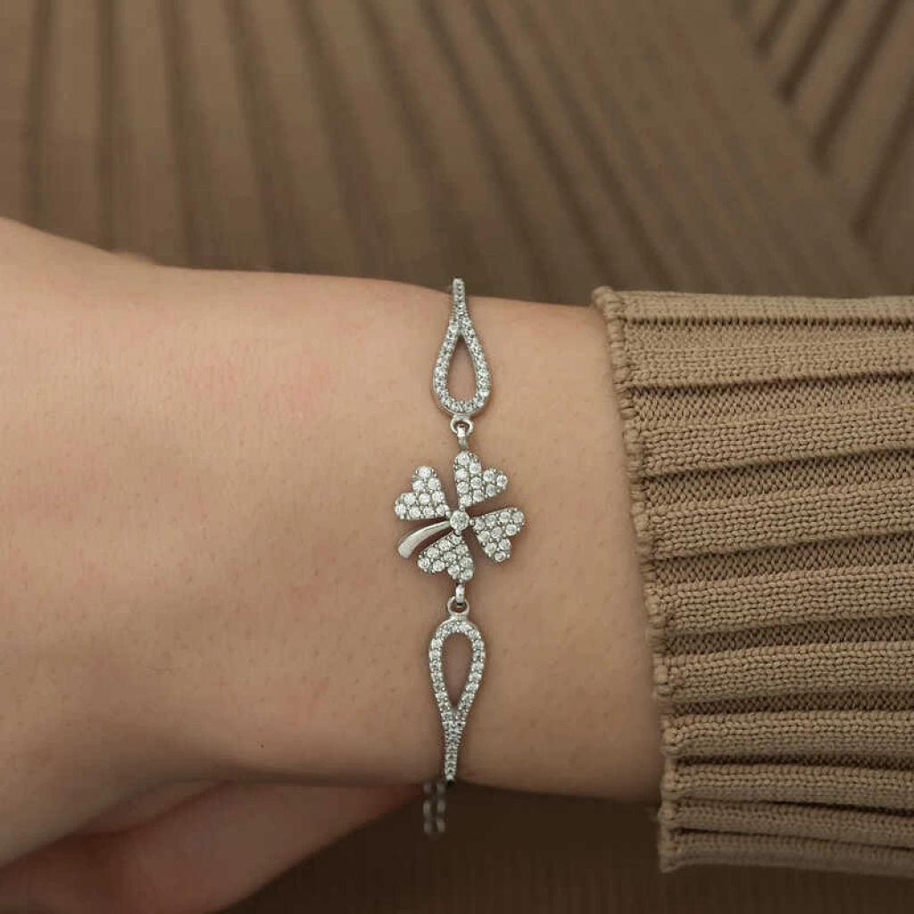 Dört yapraklı yonca bütün kültürlerde iyi şansın sembolü olarak kabul edilir. Yoncanın dört yaprağının da ayrı birer anlamı vardır. Birinci yaprak ümidi, ikincisi imanı, üçüncüsü aşkı, dördüncü yaprak ise şansı simgeler. Dört kalbin birleşmesiyle oluşan özel tasarım bayan bileklik modeli 925 ayar gümüşten imal edilmiştir. Bu zarif bileklik genç aşıkların özel günlerde tercih edebileceği çok şık bir seçenek olacaktır. Gümüş kalpli yonca bayan bileklik üzerinde rodyum kaplama vardır. Rodyum kaplama yapılan gümüş bayan bileklikler parlaklığını uzun süre muhafaza eder ve oksitlenmesini geciktirir. Gümüş yonca bayan bileklik sizin olduğu kadar sevdiklerinizin de keyifle takacağı en güzel hediyelerden biri olacaktır. Tüm gümüş bayan bileklik modellerimizde olduğu gibi gümüş yonca bileklik de el emeği ile üretilmiştir. Gümüş ve değerli taşlar nedeniyle belirtilen ürün ağırlığında ± %10 sapma olabilmektedir.