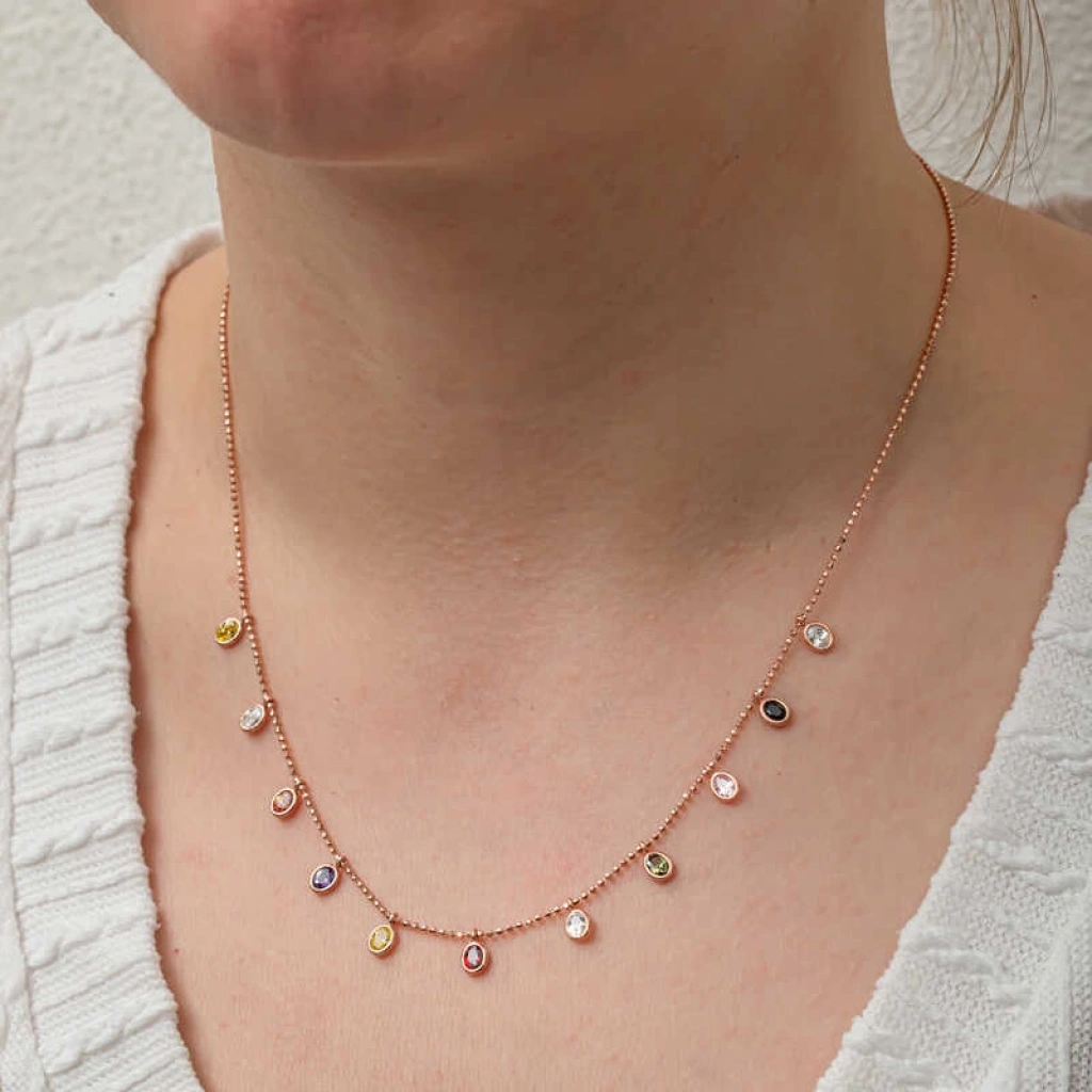 Kalbimizin ve ruhumuzun en eğlenceli tarafı olan rengarenk hayal dünyamızın yansıması özel tasarım renkli kolyeler... Bu şık kolyeyi doğum günü hediyesi, sevgililer günü hediyesi veya annelere hediye olarak özel günlerde tercih edilebilecek mükemmel bir seçenektir. Renkli kadın kolye 925 ayar gümüşten üretilmiştir.Gümüş üzerine rose kaplama yapılmıştır. Rose kaplama yapılan kadın şans kolyeleri parlaklığını uzun süre muhafaza eder ve oksitlenmesi gecikir. Tüm gümüş kolyelerde olduğu gibi gümüş renkli kadın kolye modeli de el emeği ile üretilmiştir. Gümüş ve değerli taşlar nedeniyle belirtilen ortalama ürün ağırlığında ± %10 sapma olabilmektedir.