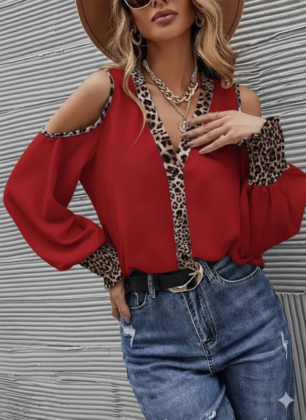 Kadın Omuzlardan Açık Yakalı önden Düğmeli Leopar Detaylı Sandy Bluz