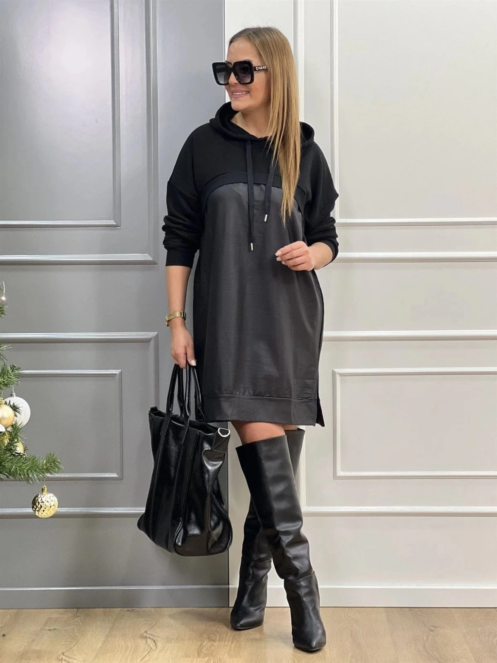 Kadın Uzun Kollu Kapüşon Ve Deri Detay Diz üstü Elbise