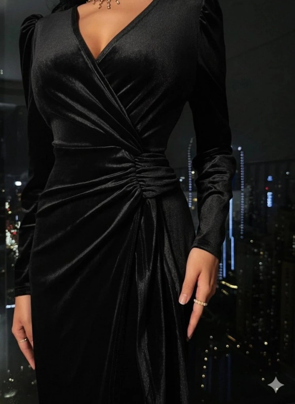 MDB Kadın Uzun Kollu Kruvaze Yakalı Yandan Büzgülü Midi Kadife Elbise