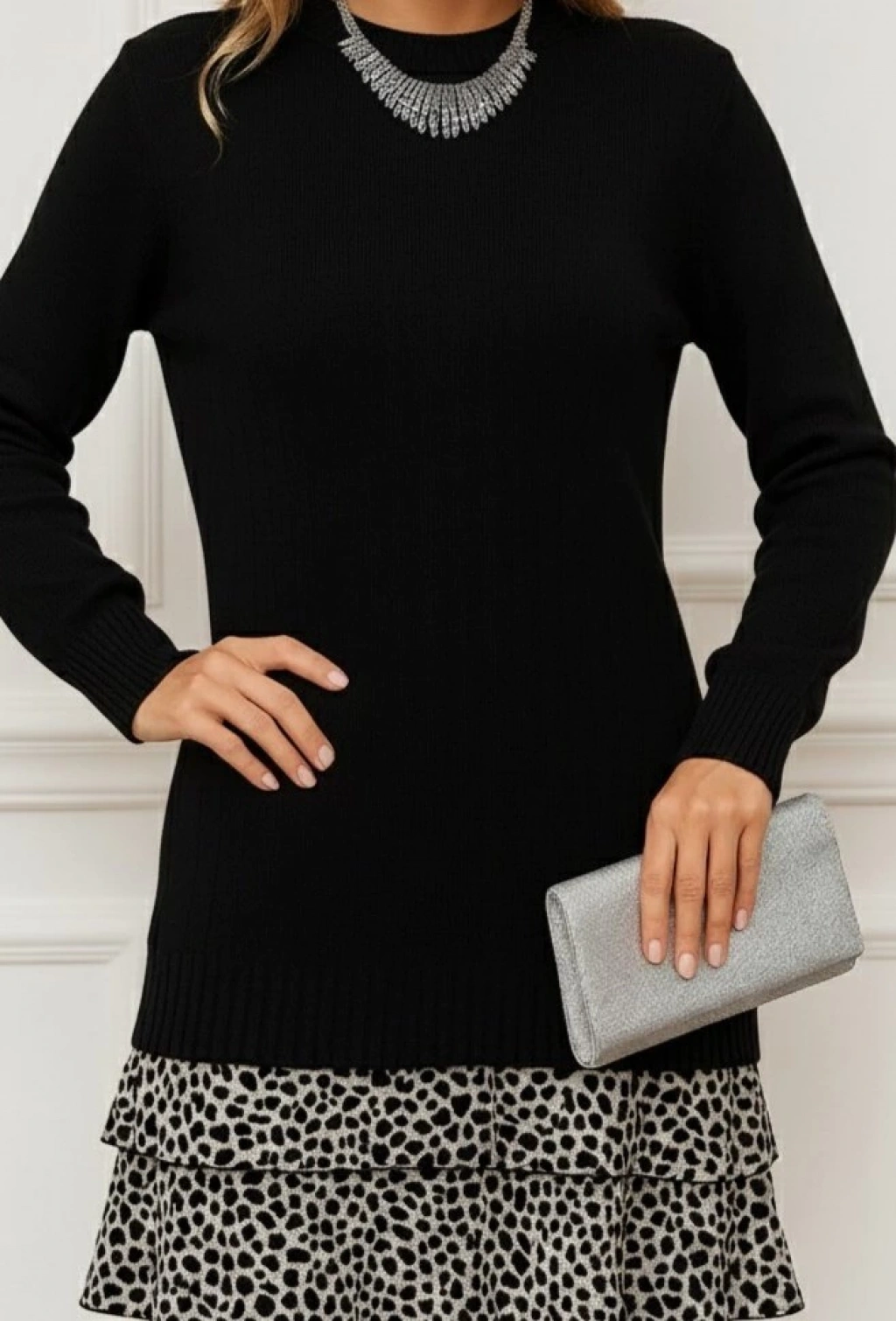 MDB Kadın Uzun Kollu üst şardonlu Kaşkorse Alt Süprem Desenli Elbise