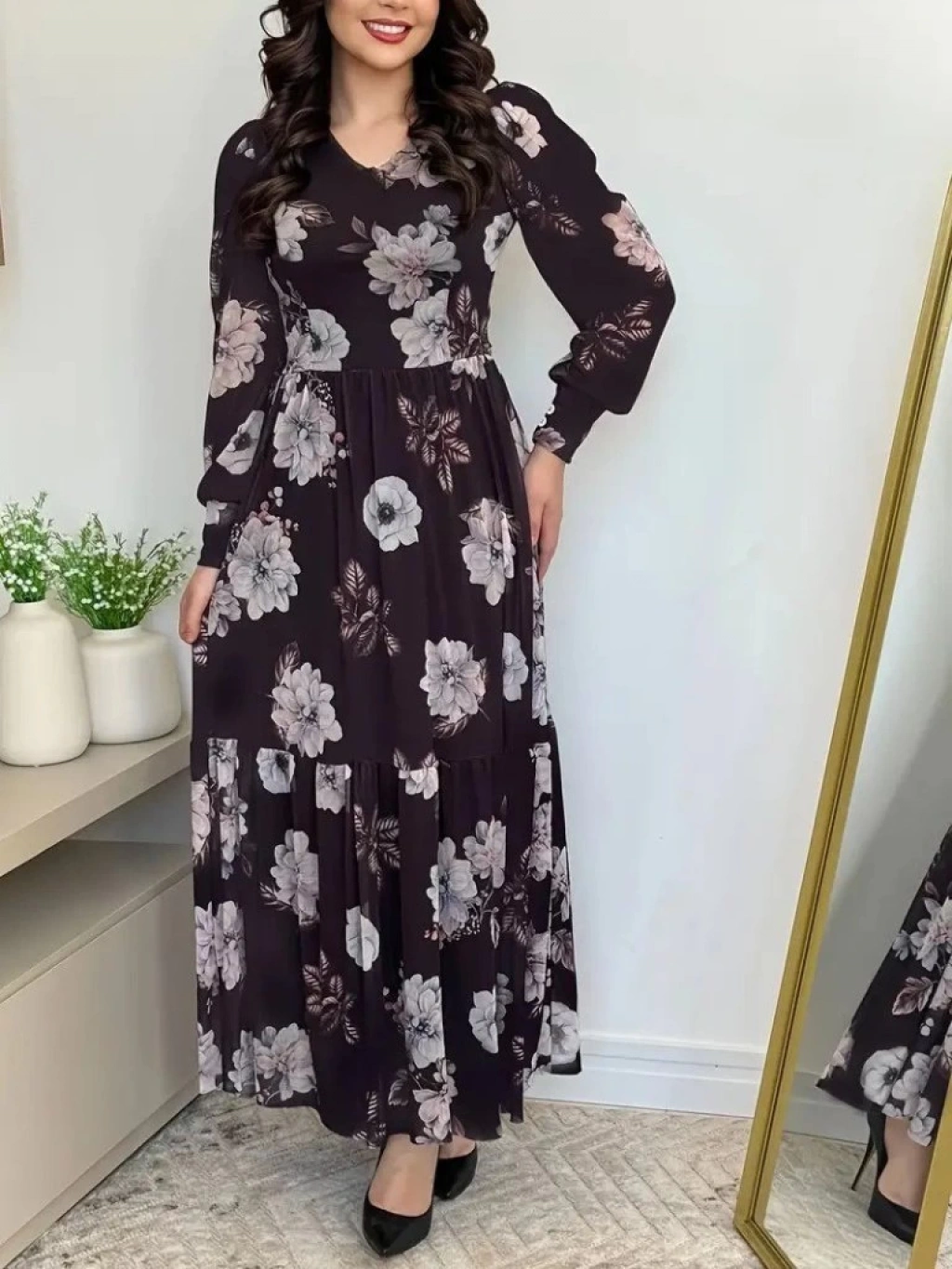 Kadın Uzun Kollu V Yakalı çiçek Desenli Maxi Süprem Elbise