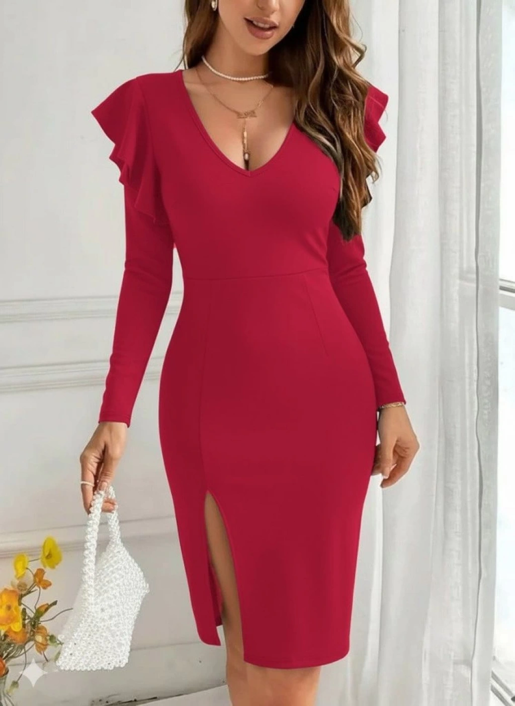 Kadın Uzun Kollu V Yakalı Yandan Yırtmaçlı Midi Ithal Krep Elbise