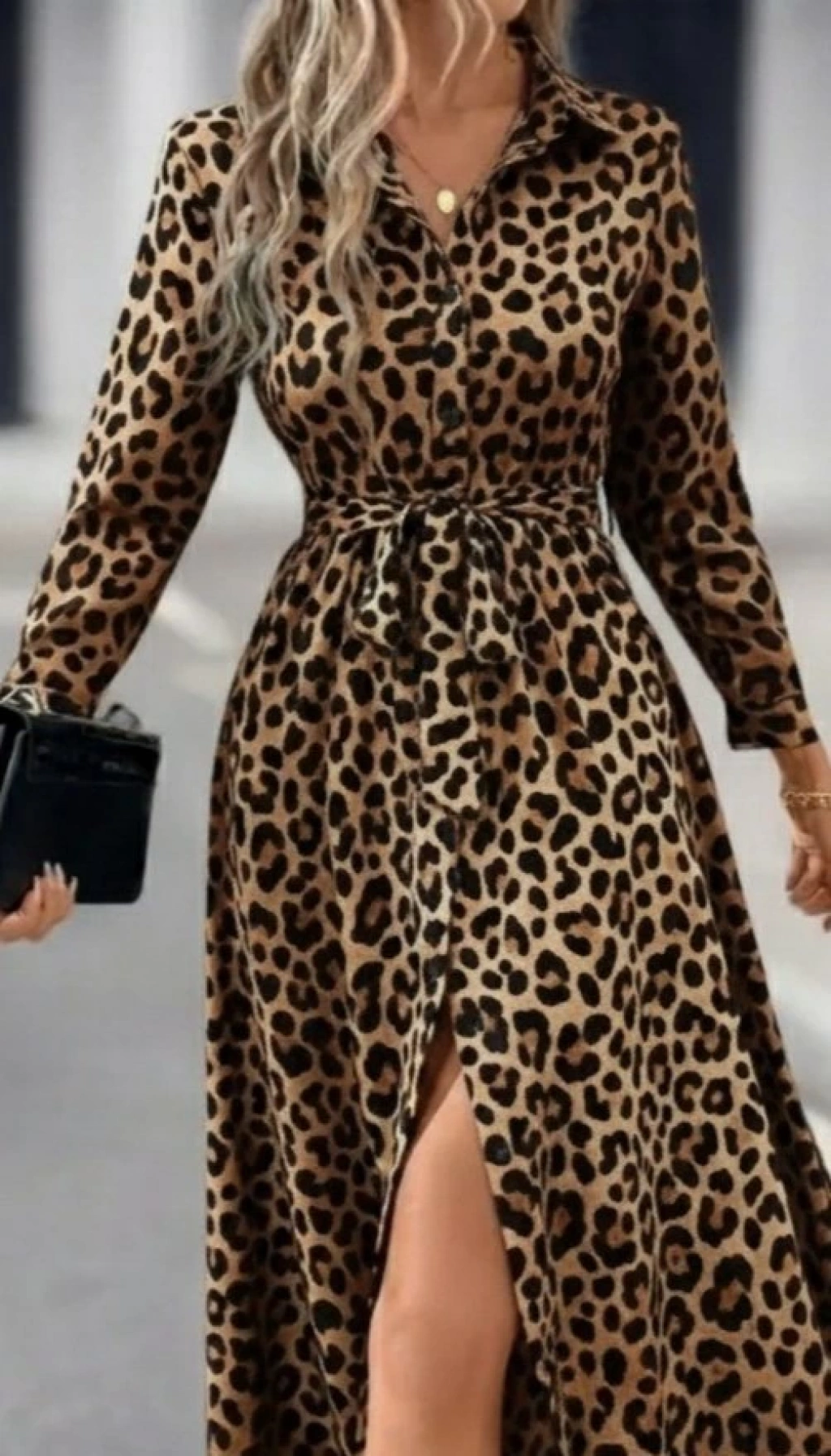 MDB Kadın Uzun Kollu Yakalı Belden Kuşaklı Leopar Desenli Modal Uzun Elbise