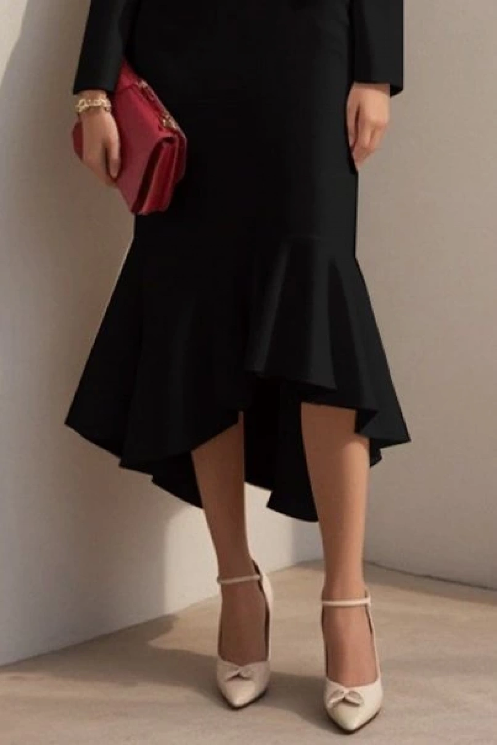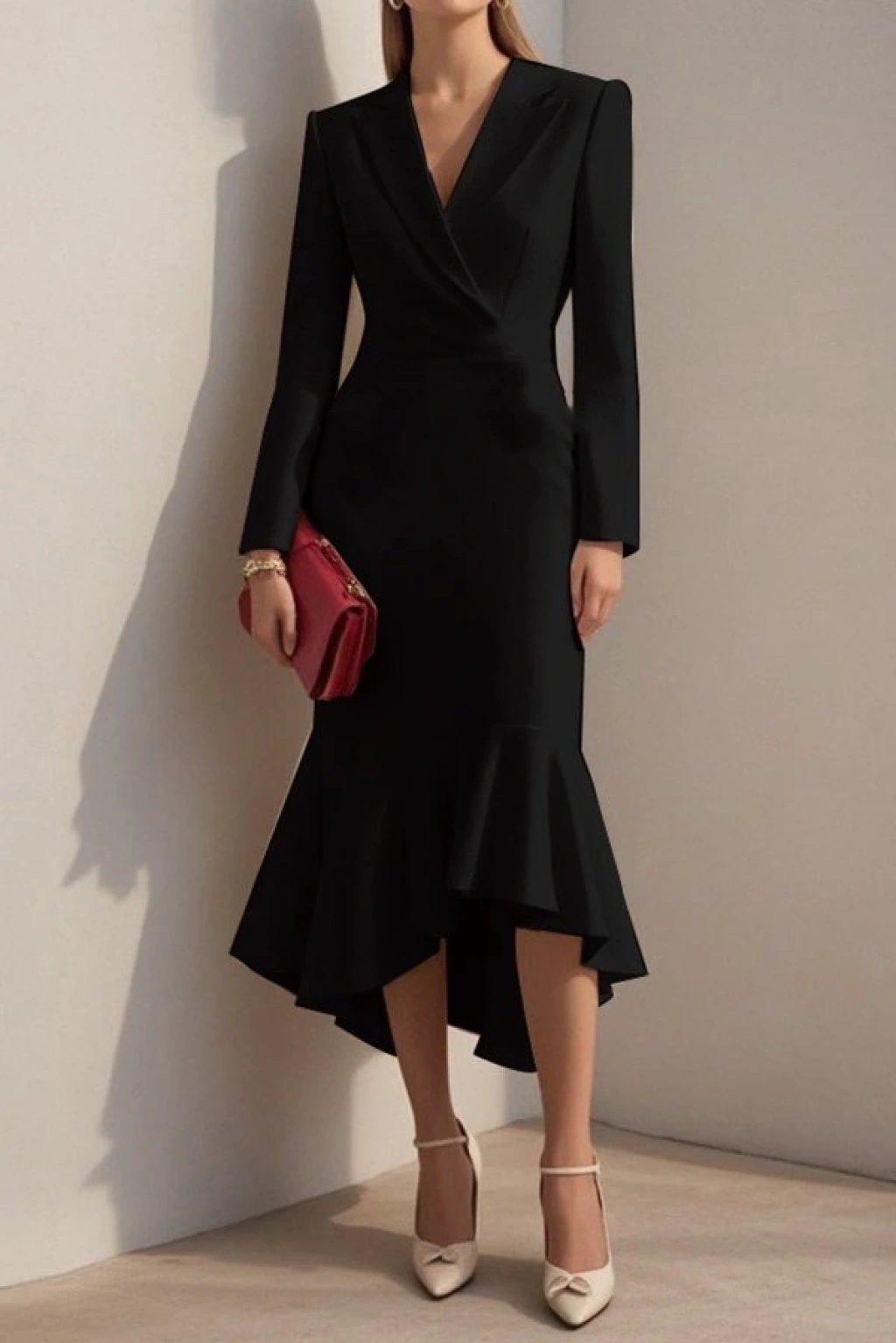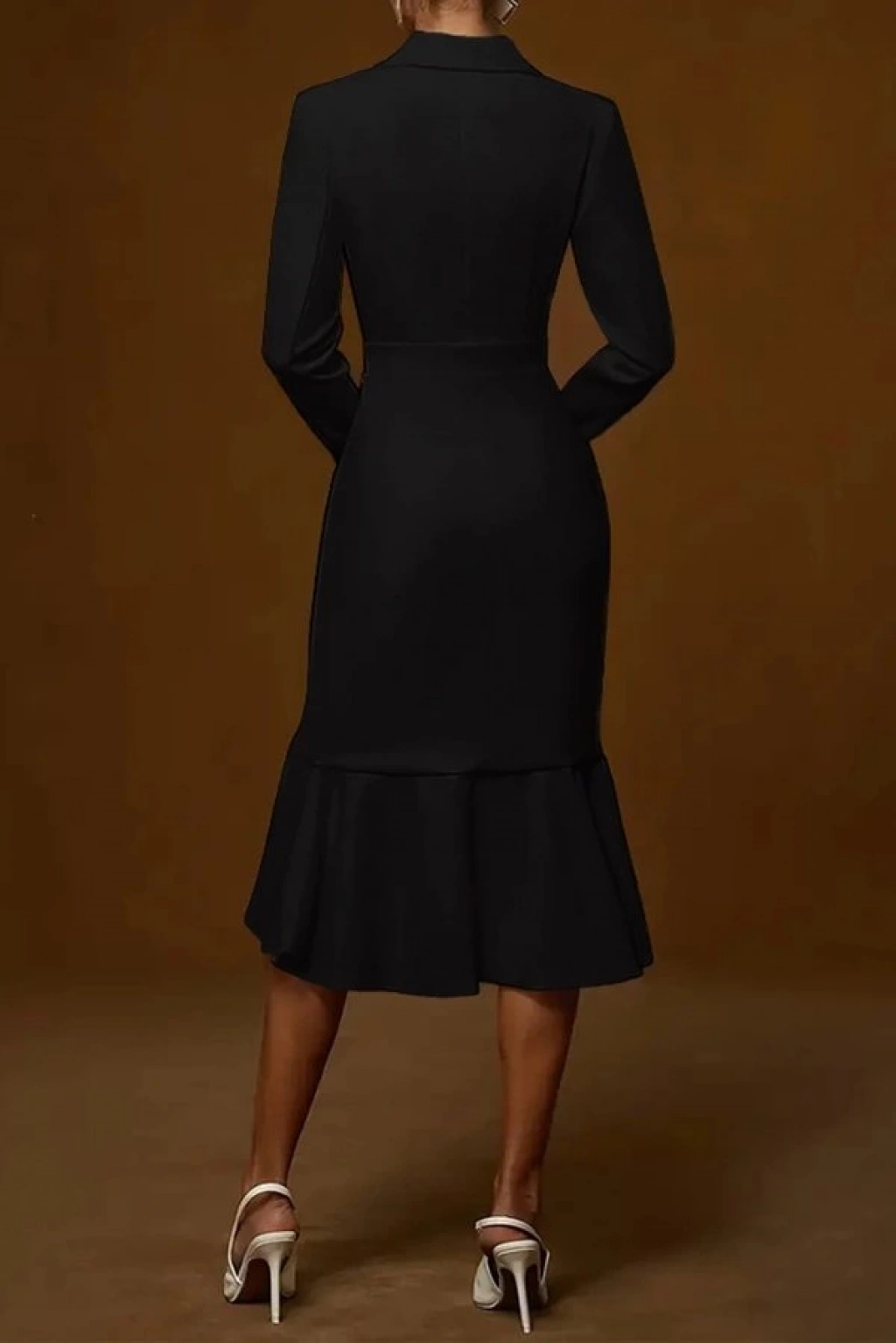 MDB Kadın Uzun Kollu Yakalı Belden Oturtmalı Midi Ithal Krep Elbise