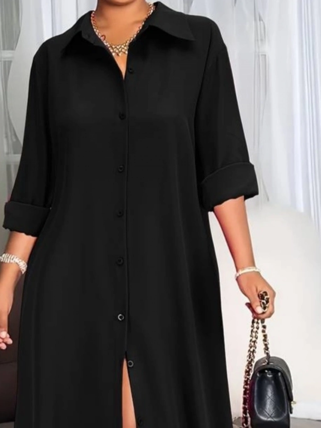 Kadın Uzun Kollu Yakalı önden Düğmeli Uzun Dokuma Elbise