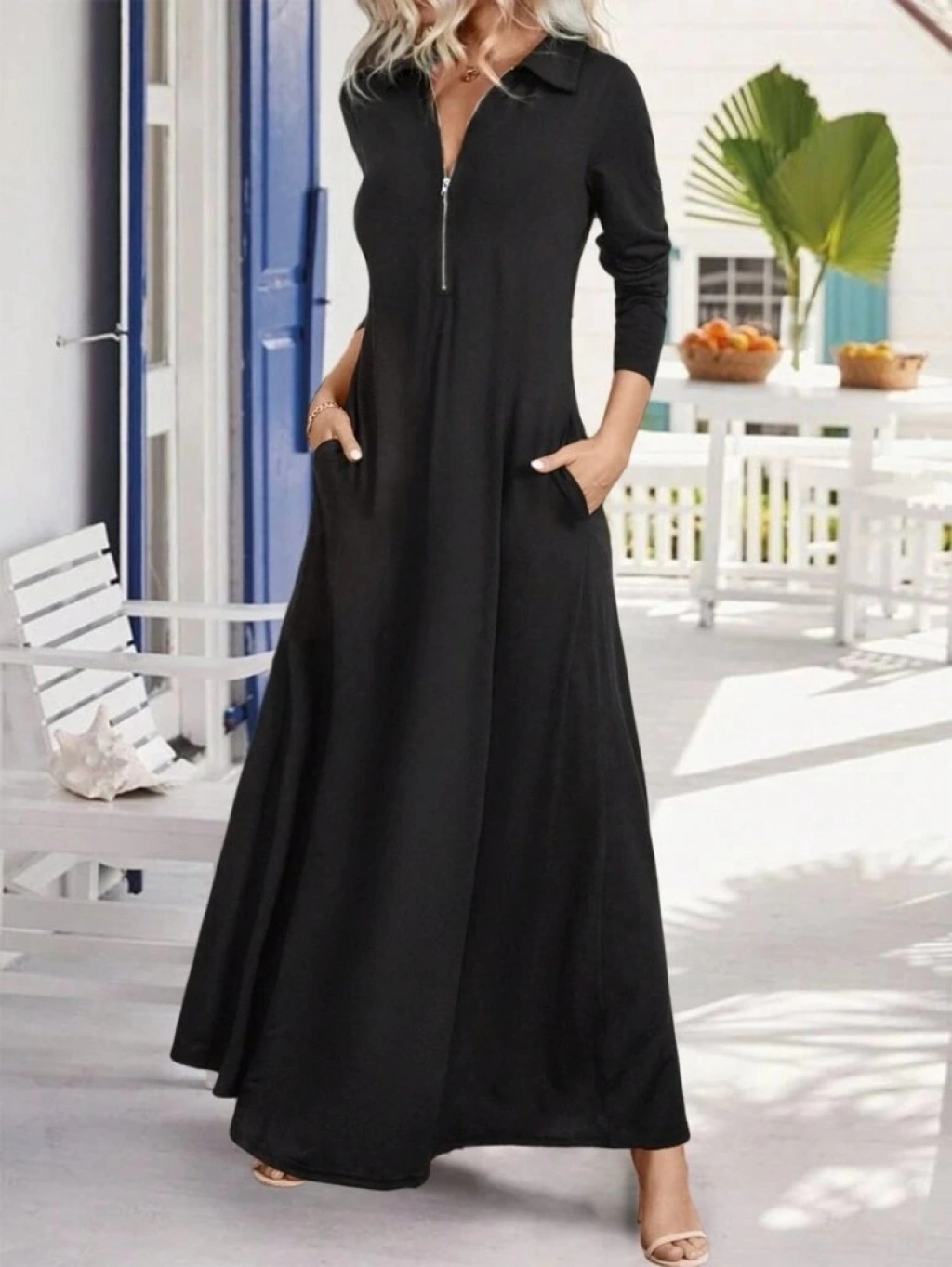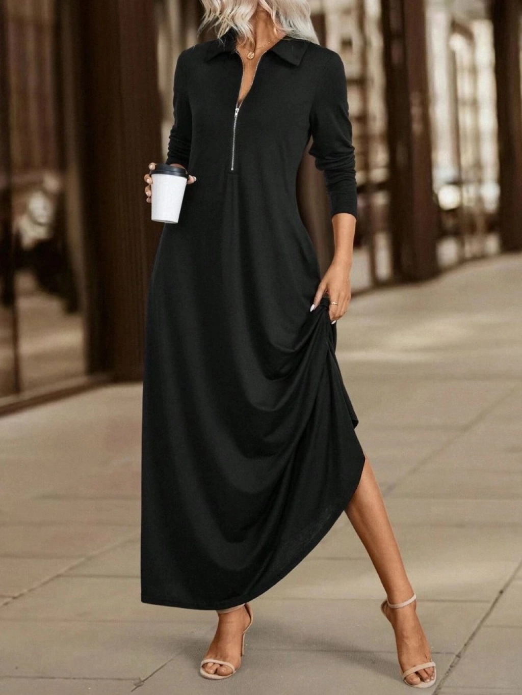 Kadın Uzun Kollu Yakalı önden Fermuarlı Uzun Viskon Iki Iplik Elbise