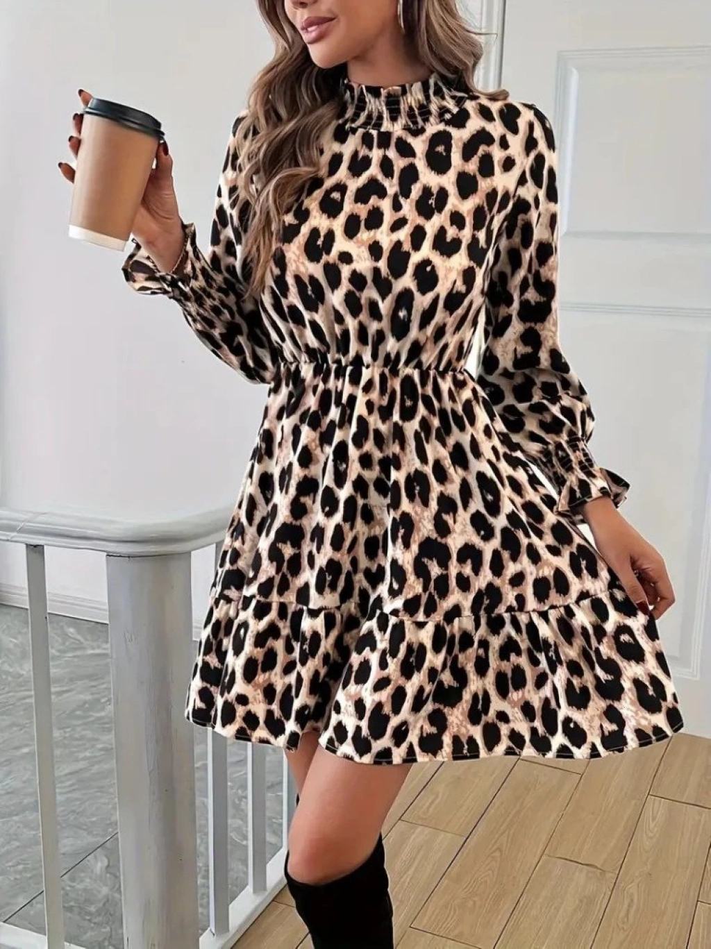 Kadın Uzun Kollu Yarı Balıkçı Yaka Leopar Desenli Modal Mini Elbise