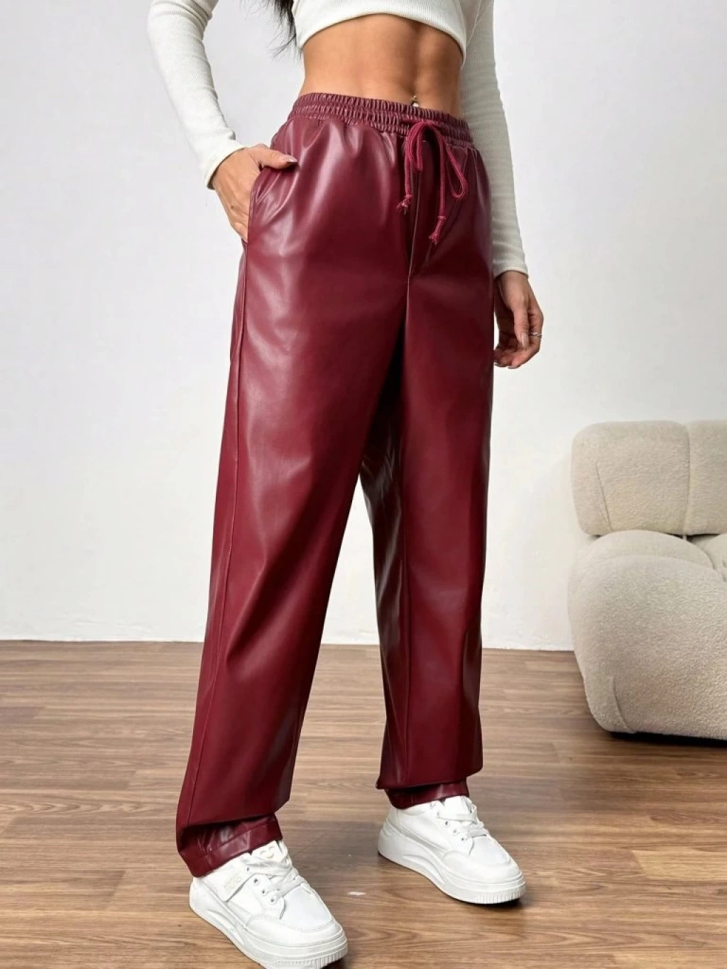Kadın Yüksel Bel Bağcıklı Deri Pantolon