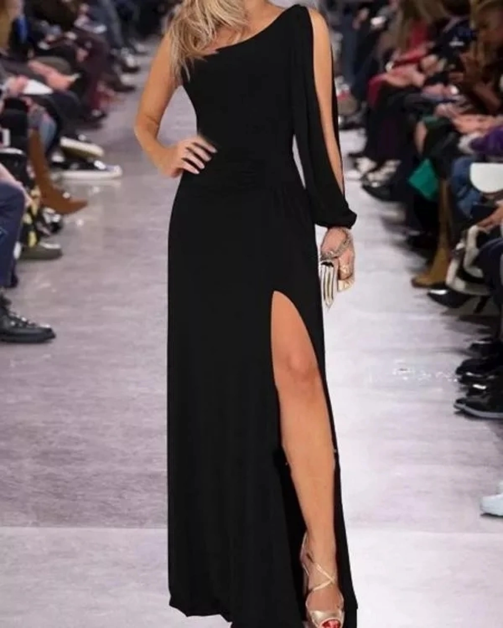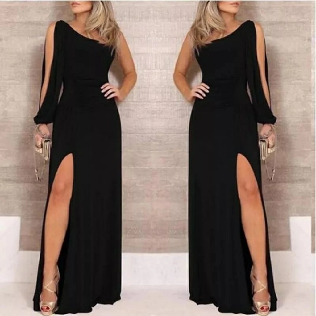 Tek Omuz Açık Derin Yırtmaçlı Krep Tam Boy Elbise