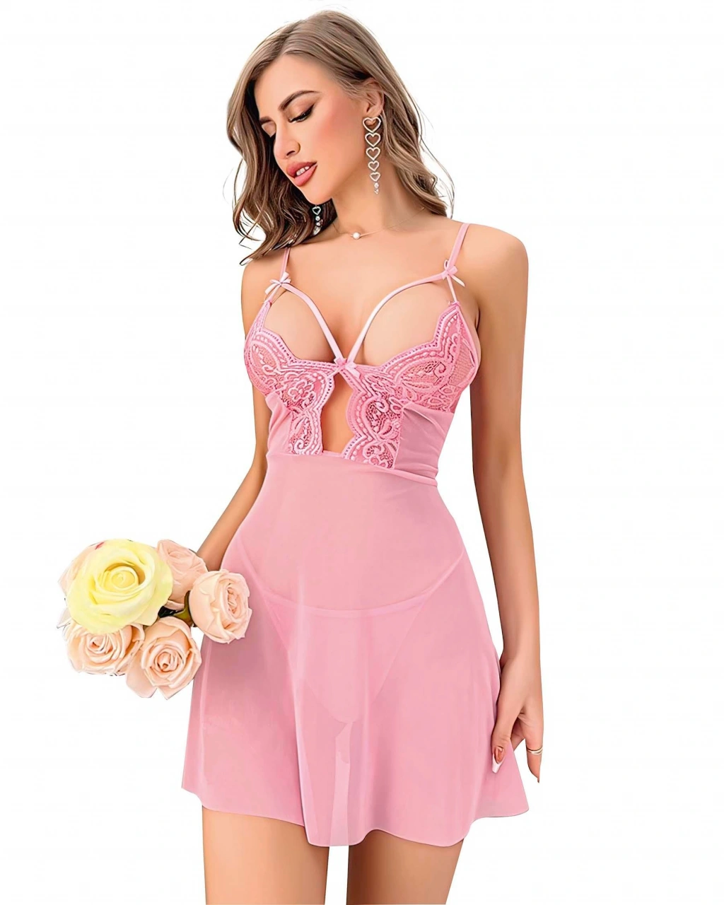 ? Göğüs bölgesinde dikkat çekici ipli dekolte ? İnce dantel işlemeli detaylarla romantik şıklık ? Vücudu saran hafif tül kumaş ile zarif transparanlık ? Uyumlu string iç çamaşırıyla tamamlanan takım