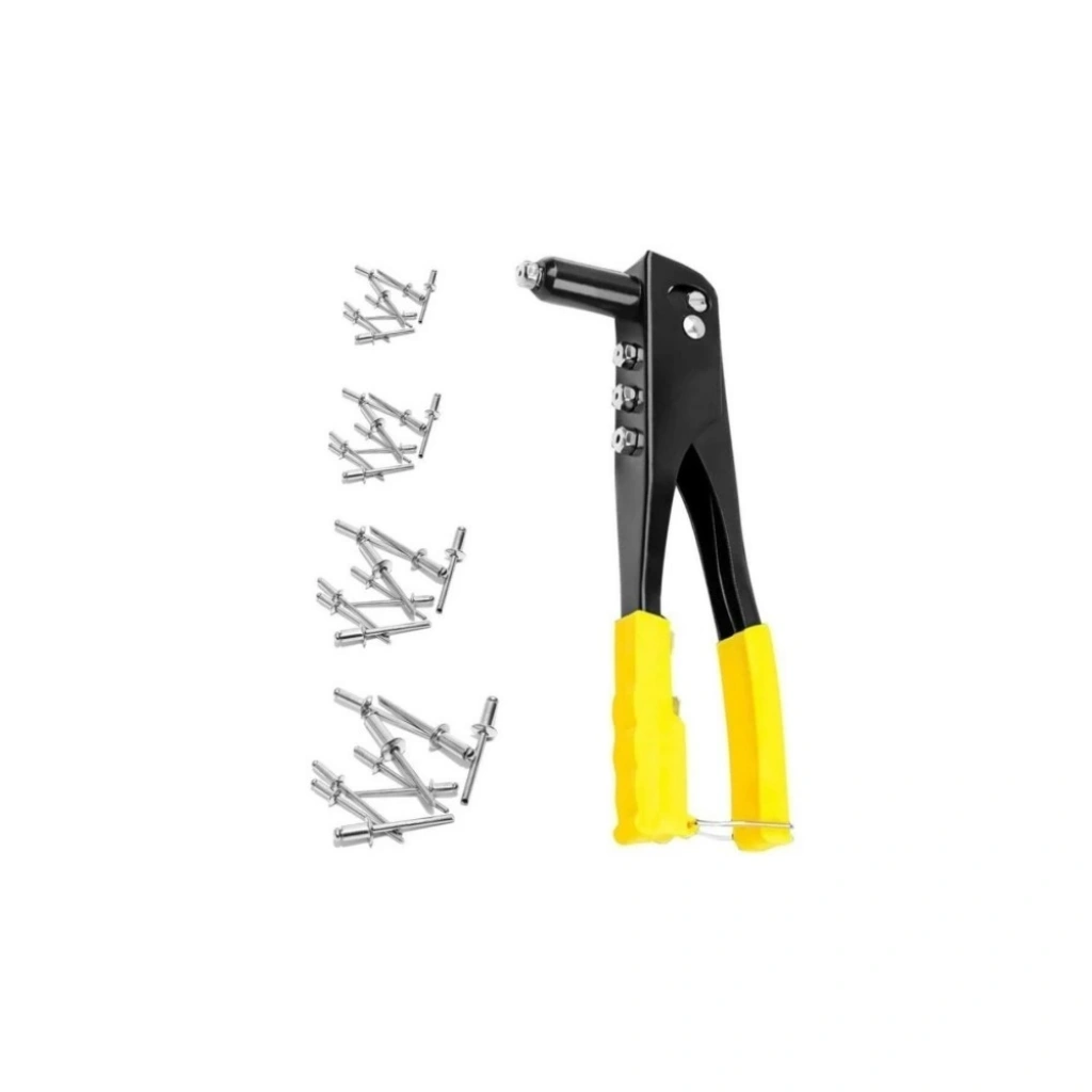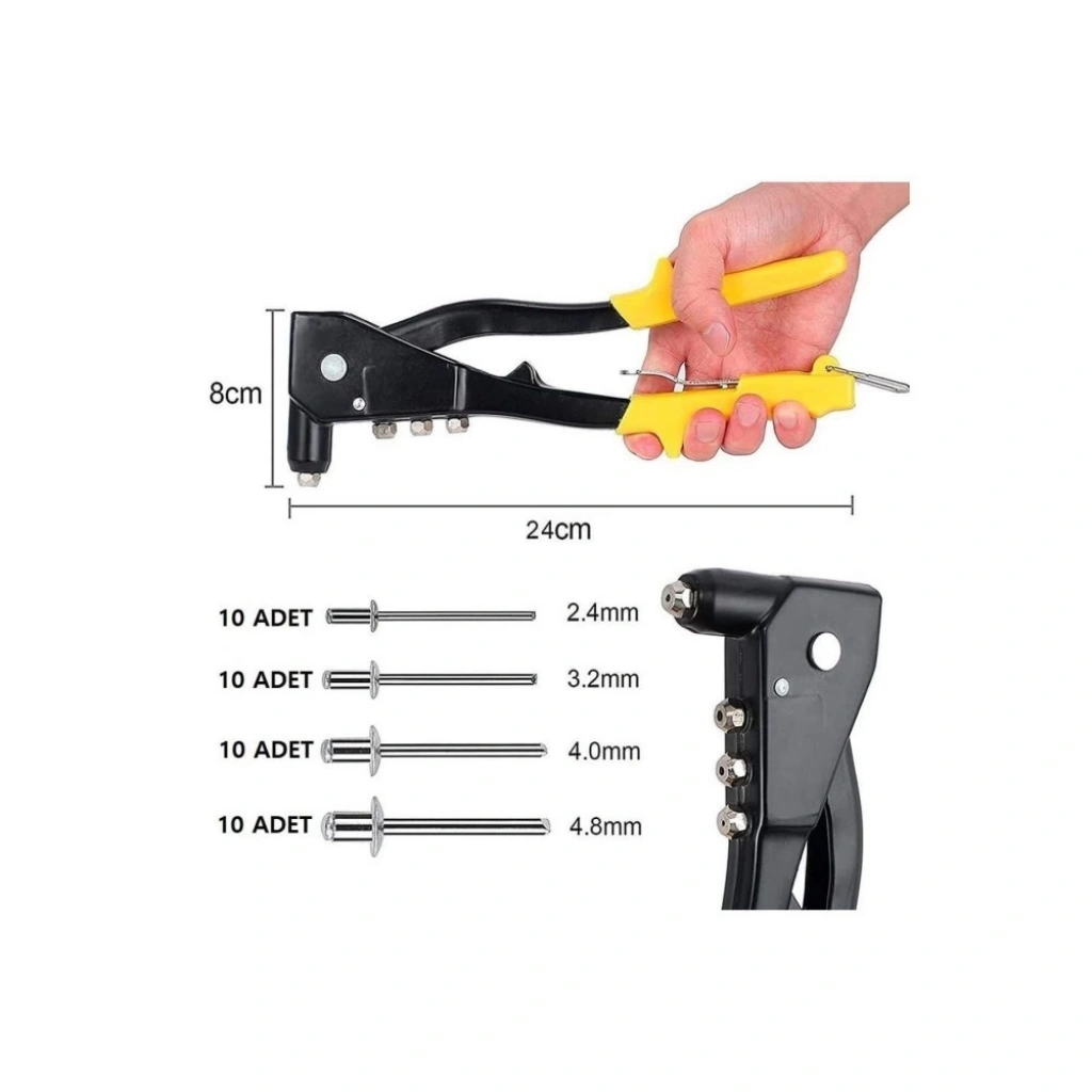 Ürün Ölçüsü: Genişlik: 8,5 cm Boy: 24 cm Paket İçeriği: 1 Adet Profesyonel Perçin Tabancası 4 farklı boyda toplam 40 adet perçin.
