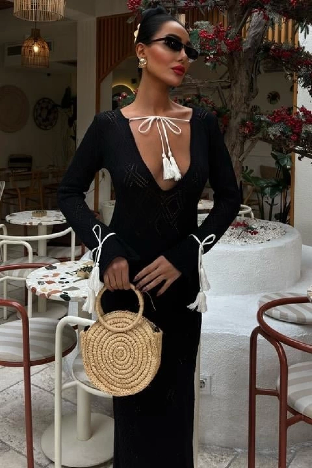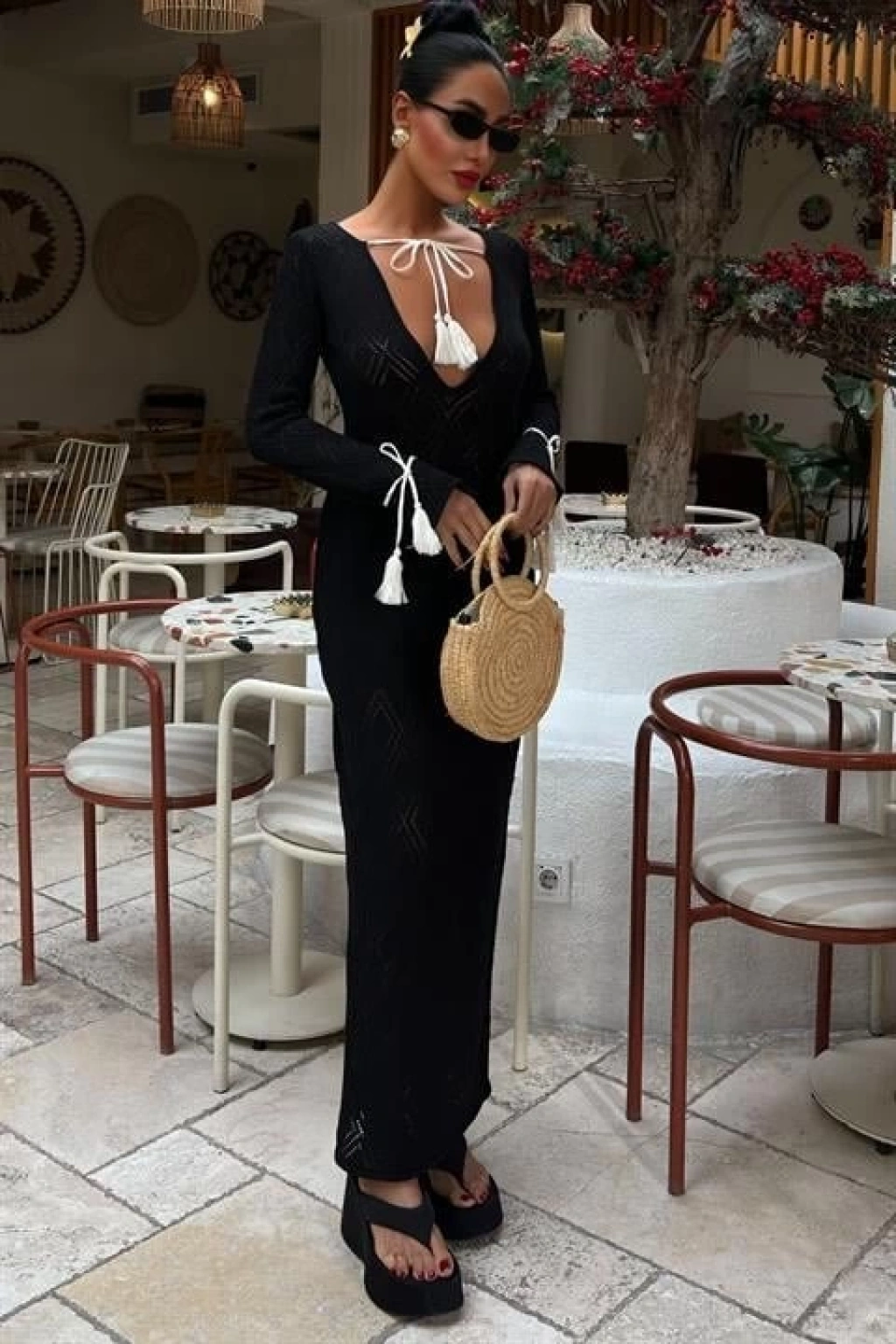 MDB Püskül Bağcık Detaylı V Yaka Ajurlu Elbise 2850